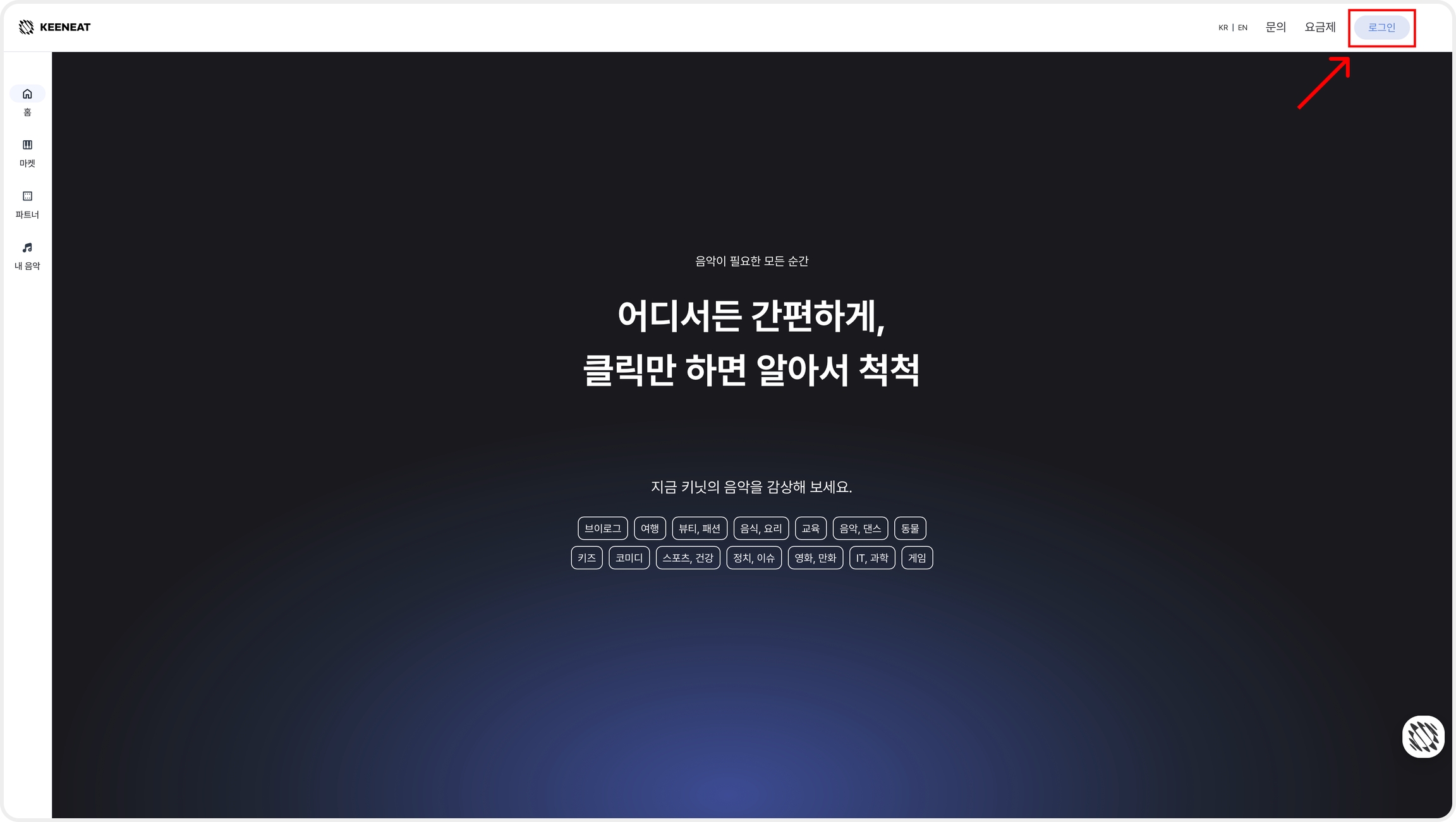 연결된 키닛 랜딩페이지에서 우측 상단의 ‘로그인’ 버튼을 클릭합니다.